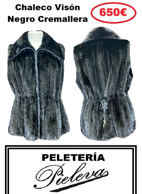 Exclusivo chaleco confeccionado en lomos de visón negro de alta calidad. Diseño moderno con cierre de cremallera y cordón ajustable. Ligero y elegante.